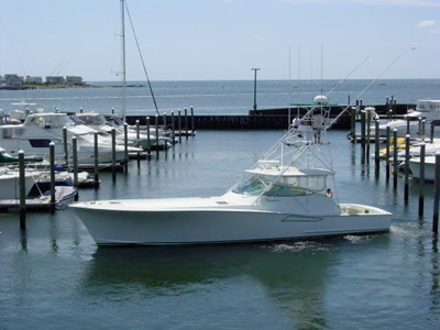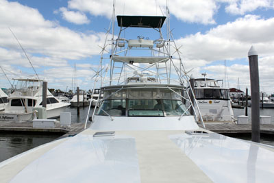 The "Fish Tricks" is a 57 x 17 ft. Gillman sportfishing machine, powered by twin 800 hp Caterpillar Diesels. Capable of cruising at 30 knots, she has a huge cockpit with fighting chair, transom door, saltwater washdown and 50 gallon live well. Two steps up from the cockpit you'll find the air conditioned express bridge with helm seating for three. To port on the bridge there's a day sofa, and to starboard is deep bait freezer and sink-prep station. The helm also features a full complement of the newest in touch screen electronics (LORAN, depth finder, 72 mile RADAR, GPS / plotter), synchronizer, SSB radio, two VHFs, with an EPIRB on the hardtop, and Sirius XM Radio.