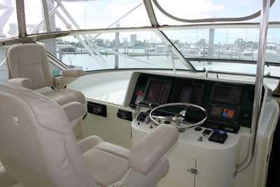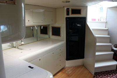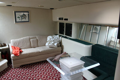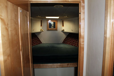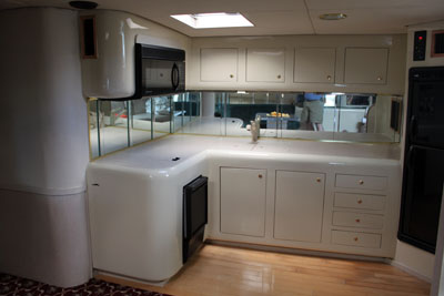 From the bridge, take the stairs down to a very large salon that to port features a forward-facing leather sofa and another l- shaped sofa. The salon also features a Trackvision-fed TV with DVR / VCR, and AM / FM / CD. A full galley is located to starboard and includes a double sink, micro / convection oven with electric range, and a refridgerator / freezer with icemaker. Moving forward via hallway, you'll pass crew bunks amidships to port. The head (bathroom) is amidships to starboard with fiberglass shower. The air conditioned master stateroom is forward with a centerline King berth.