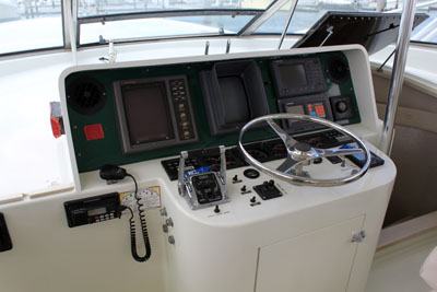 The tuna tower offers bench seating facing forward, two individual seats facing aft, Furuno electronics, and engine and anchor controls.
